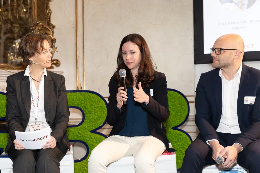 Bei der Podiumsrunde haben Erich Benischek (Blaue Lagune), Thomas Glanzer (Alukönig Stahl GmbH), Elmar Hagmann (Sedlak Bau), Markus Diesenberger (GF Piping Systems) und Vanessa Vivian Wabitsch (W.CREATE) Erfahrungen aus der Praxis mit nachhaltigen Baustoffen und Technologien geteilt. Obwohl die Erfahrungen in verschiedenen Bereichen des Bauens kommen, war Einigkeit darüber, dass für zirkuläres Bauen frühzeitige Planung und Einbeziehung aller Akteure essentiell ist. Außerdem ist die Diversität der Baustoffe sowie die lokale Beschaffung wichtig, um ressourceneffiziente Gebäude zu entwickeln und resilient zu sein – wirtschaftlich und politisch.